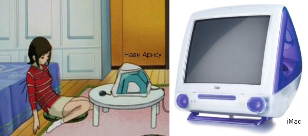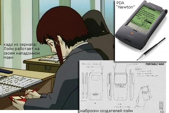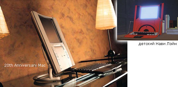 : имейте в виду, что это - ни в коей мере не реклама Макинтошей, ни разборка "Macintosh против PC", а лишь подборка указаний на конкретные эпизоды сериала, где встречаются те или иные ссылки на продукцию компании Apple : Think (up) different эта надпись мельком появляется в слое 11: Инфорнография "Think different" ("Думай иначе" или "Думай по-другому") - одна из самых удачных рекламных кампаний Apple. идея кампании заключается в исторических фигурах, которые изменили мир, думая иначе, чем люди, окружавшие их. и слоган "Think different" призывал покупателей Apple думать иначе, развивать в себе другой тип мышления и креативности, чтобы выгодно выделяться из толпы других людей смотрите также: пресс-релиз Apple к рекламной кампании Think Different // подразумевается - выгодно выделяться из толпы пользователей PC. сейчас, насколько я знаю, главный слоган Apple - "Switch" ("Переключайся") : NAVI Нави - это персональные компьютеры, используемые в мире лэйн. Нави бывают как настольные, так и компактные (наладонники). все компьютеры Нави подключены к Сети Нави - это сокращение от слов Knowledge Navigator (Навигатор Знаний). Джон Скалли, CEO* компании Apple с 1983 по 1993, описал Навигатор Знаний в своей книге "Одиссея" (1987). Навигатор Знаний представлял собой его видение компьютеров Apple в 21м веке. в точности предсказывая множество изменений, принесенных в нашу жизнь Интернетом, Навигатор Знаний позволяет людям общаться друг с другом, находясь в любой точке планеты, а также позволяет подключаться к гигантской гипертекстовой (здесь Джон Скалли цитирует Теда Нельсона) базе данных, а также использует различные программы искусственного интеллекта для быстрого и продуктивного поиска информации в ней Навигатор Знаний, описанный Скалли в 1987 году, ориентирован на выполнение мультимедиа-приложений, используя большой высокоточный плоский дисплей для отображения текста, полноцветной графики и компьютерной анимации. также он способен распознавать и генерировать речь, а также воспроизводить звук высокого качества. Скалли подчеркивал, что его Навигатор Знаний не привязан к определенной форме, он может быть как настольным, так и наладонным, и даже может быть вшит в одежду множество идей. задуманных в Навигаторе Знаний, Скалли пытался реализовать в "Ньютоне", в той или иной мере неуспешном PDA** компании Apple. его видение будущего компьютеров, пусть даже и не реализованное в полной мере, было весьма важным для развития всех околокомпьютерных технологий, равно как и его предвидение изменения назначения компьютеров - из рабочего инструмента в средство обмена и поиска информации смотрите также: статья Джона Скалли о Навигаторе Знаний * - CEO расшифровывается как Chief of Executive Office. приблизительно это означает "исполнительный директор" ** - PDA расшифровывается как Personal Digital Assistant, персональный цифровой ассистент. дальний предок современных наладонников : детский Нави Лэйн до того, как Лэйн получает новый Нави, она пользуется старой моделью, "детским Нави", как говорит отец дизайн детского Нави весьма похож на дизайн "Макинтоша 20й Годовщины" (20th Anniversary Macintosh, он же Spartacus). эта машина имела довольно неожиданный дизайн, даже по стандартам Apple, очень высокую производительность для того времени, LCD-дисплей и звуковую систему Boso. ее цена была около $10000, поэтому продавалась эта модель из рук вон плохо смотрите также: несравненный The Apple Twentieth Anniversary Macintosh : наладонный 